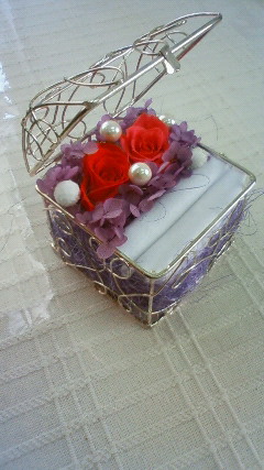 リングピロー茨城県筑西市のお花の教室f.messageです。リングピロー色々なデザインで作成できますが、雑誌等を見て検討した結果、一番使用しやすくお花の存在感も出せるデザインになりました。リング台の部分もすべて1から手作りしています。お花も大きめのものを使用し、存在感をUP!