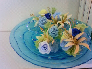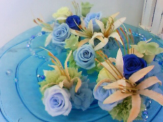 寒色系のお花を使って涼しそうなアレンジメントの完成♪
