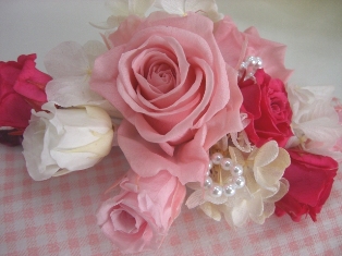 コサージュ先日のコサージュ。プリザーブドフラワーです。お花を多めに使ってボリュームのあるものを希望とのこと。写真では分かりづらいのですが、オーバルのデザイン。すべてお花のみでグリーンは使っておりません。先日の卒業式と今度の入学式、両方で使っていただけるそうです。プリザーブドフラワーならではですね☆