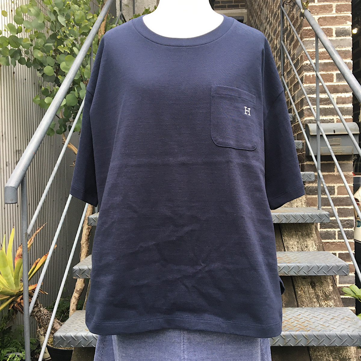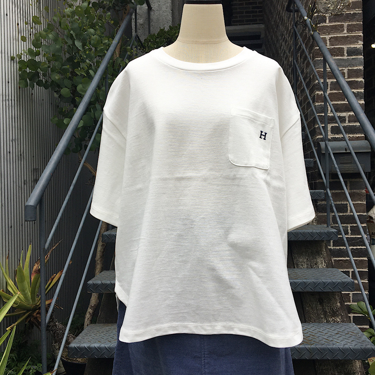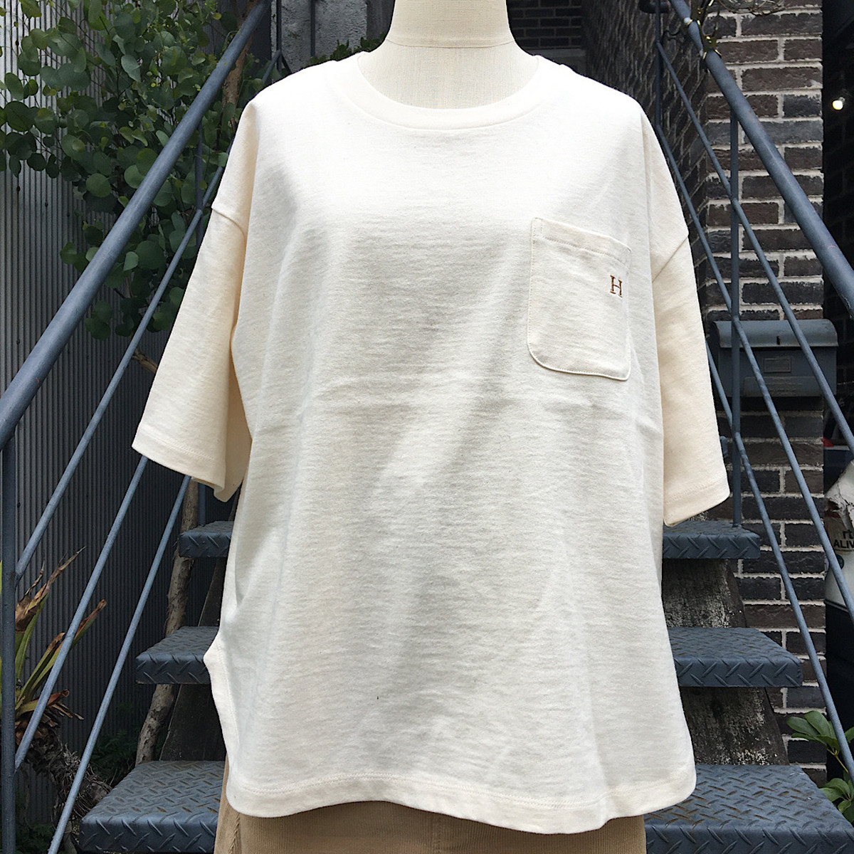 ゆったりとしたシルエットや胸にあしらわれた「H」刺しゅうもポイントです。