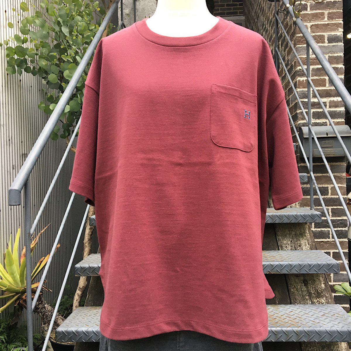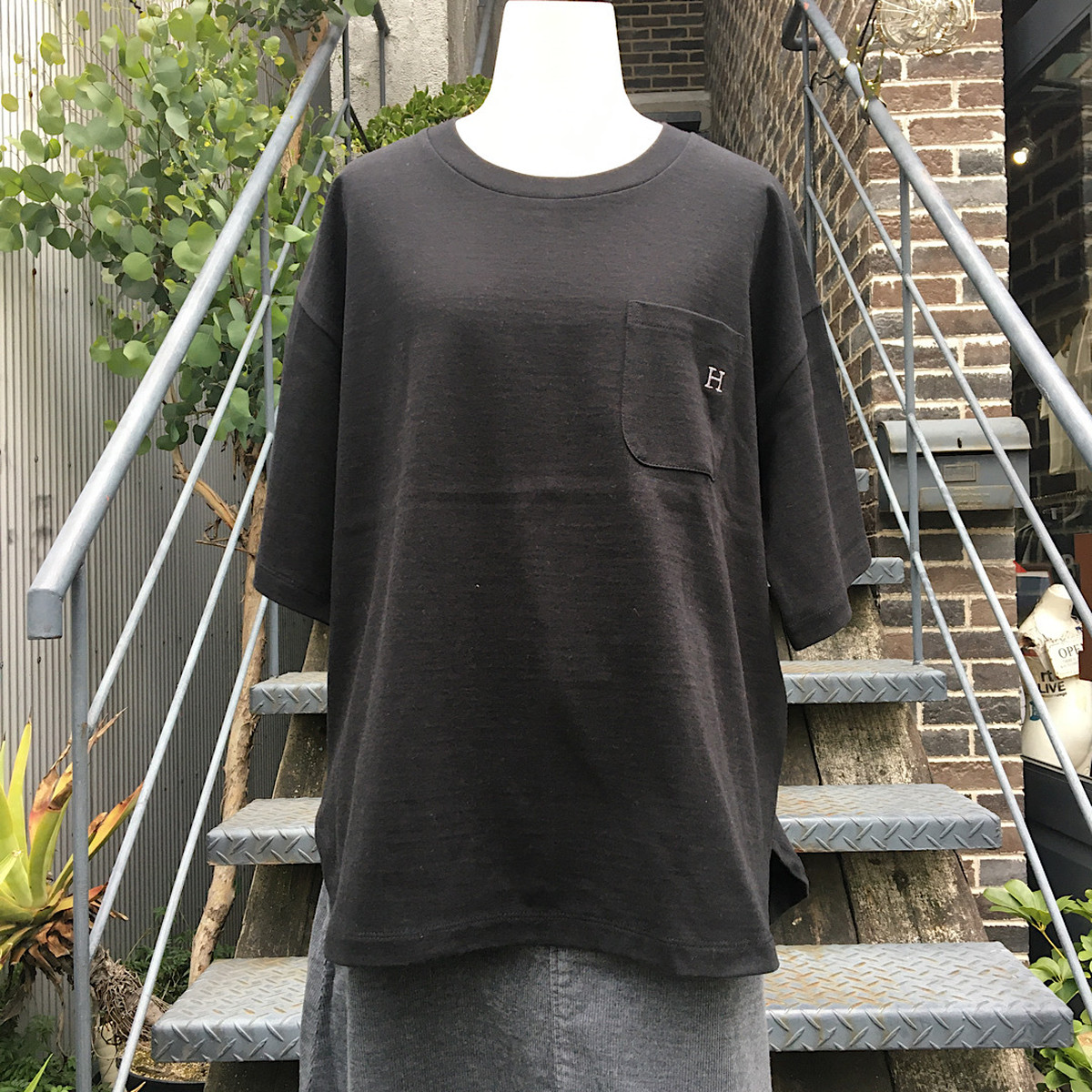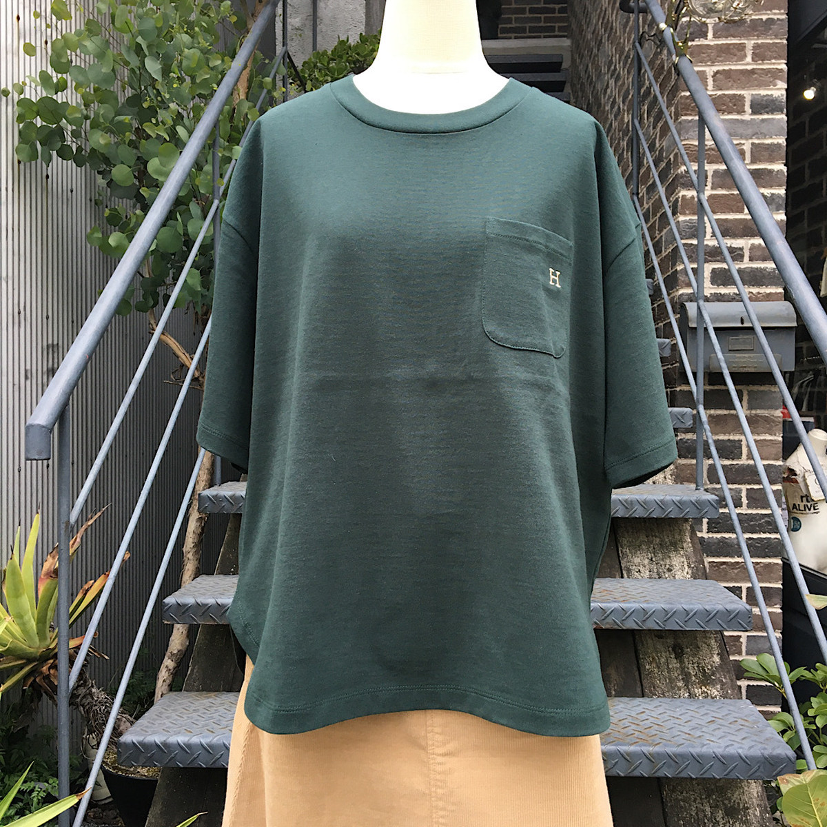 ゆったりとしたシルエットや胸にあしらわれた「H」刺しゅうもポイントです。