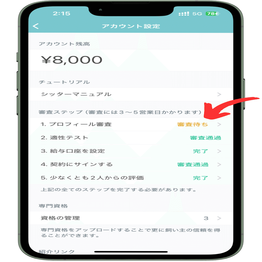 登録後、「マイページ」を開き、「プロフィール編集」から、個人プロフィールを記入しましょう。その後、マイページに戻り、「シッターページ」の「プロフィール審査」 をクリックし、最初のステップである基本的な個人情報を入力して身分証明を行います。
