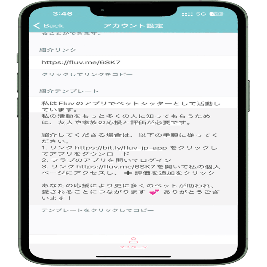 アカウント設定の下部に、推薦用のリンクとテンプレートが表示されます。リンクまたはテンプレートをコピーし、友人や知人に送信してください。