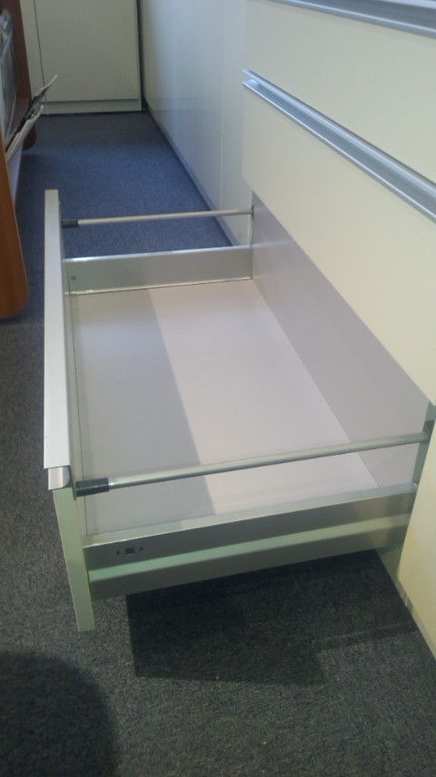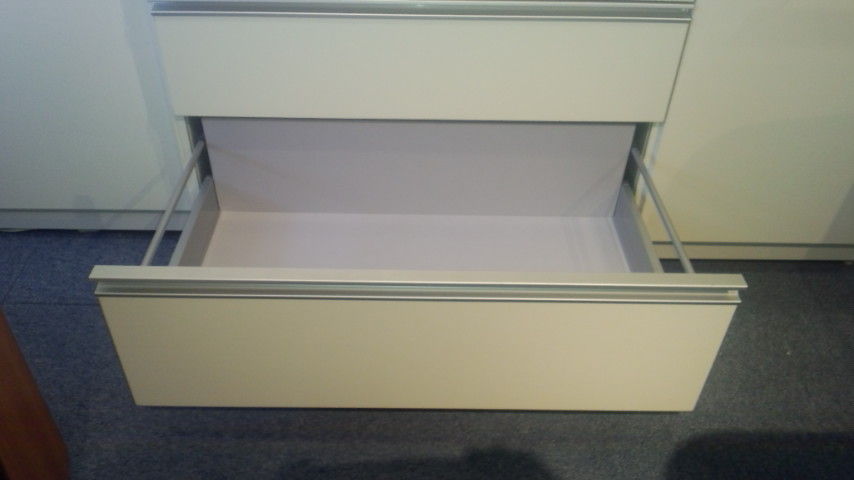 今までご紹介したレールはBOX部分がシナベニアで出来ているので、液体をこぼすと板に吸収されてしまいますが、このレールシステムの場合、引出の底板は前板や天板と同じパーチクルボードを使用します。