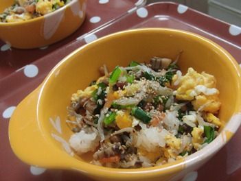 仕上げに あらかじめ作っておいた 炒り卵を混ぜ合わせたら
