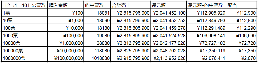 「2→1→10」とは票数が20倍くらい違う。当然配当も約20分の1。