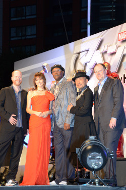 左から、ジョス・ウェドン監督、米倉涼子、サミュエル・L.ジャクソン、竹中直人、ケビン・ファイギプロデューサー 拡大画像を見る |
