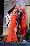 また、スカーレット・ヨハンソン演じる女スパイ・ブラック・ウィドウの声優を務めた米倉は「1人でも映画になっちゃうヒーローたちをまとめてるの で、とてつもないパワーがある。期待して見て下さい!」とアピール。演じるにあたり、スカーレット本人から「ジャック・ダニエルを飲んで、煙草を吸って、 カラオケして、ガラガラの声でやって」とアドバイスを受けたそうで、「ちょっと、それは出来なかったので、冷静さと頭の回転の良さとセクシーな部分を意識 して頑張りました!」とアフレコを振り返ると、ジョス監督に「スカーレットって誰ですか? ってくらい美しいですね」と言われて照れ笑いしていた。