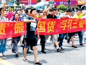 先頭は赤い垂れ幕を持って行進したが、垂れ幕の内容は「日本製品を排斥し、国産製品を振興さ