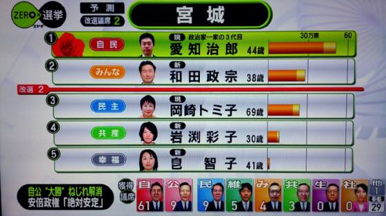 宮城(定員2)は、自民に当確。残り1議席。⇒みんな(和田政宗)に当確!岡崎トミ子は落選!