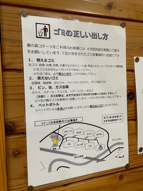 霧の森コテージ その5 朝食霧の森コテージ その4 夕食に続き 朝食です。 夕食とはうってかわり 朝食は前日に弁当形式で部屋に持ち帰るシステムです。 電子レンジに500ワットの設定がありません。 適当に温めます ゴミ出しも必要みたいです ご馳走様でした。