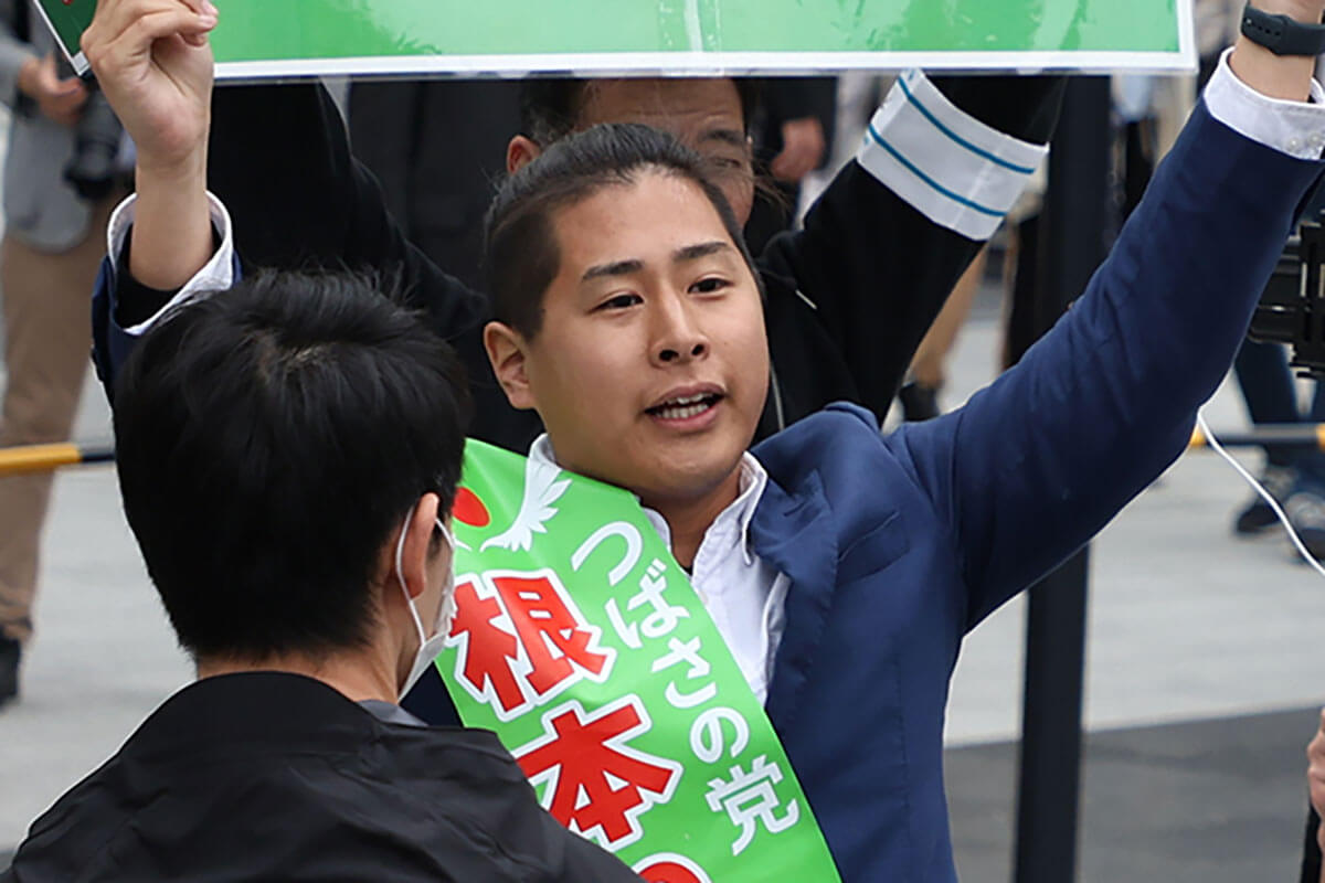 車線の片側が封鎖され、乙武洋匡候補の選挙カーを取り囲むように幾重もの鉄柵が設置されている。そこかしこに立って目を光らせている背広姿の男性たちはみな警視庁のSPだ。