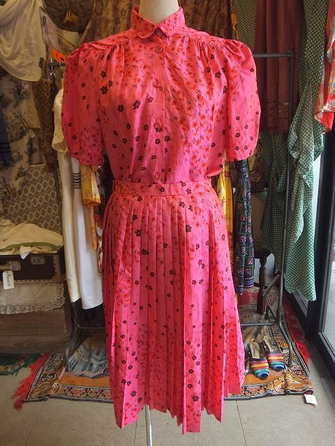 ヨーロッパ古着偏光VIVIDピンクシルク・赤・黒花模様プリーツスカートセットアップ