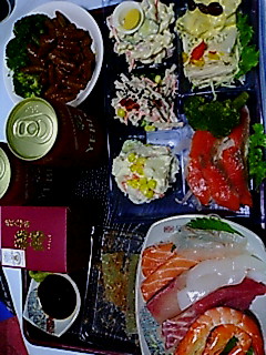 99/100ただいまから一人忘年会が開催されます。刺身に子持ち昆布、5種類のサラダ、こてっちゃんかと思って買ったとんちゃん。今まで飲んだビールの中で一番おいしかった琥珀エビス、地元の酒梅錦。日本酒チャンピオンズカップグランプリを受賞した日本酒で、もちろん純米大吟醸。これらが最高な忘年会を演出してくれます。それでは一人忘年会スタート!あ、ごはんと漬物とお茶とちまきもあるよ。