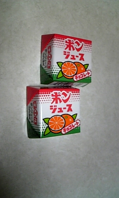 チロルチョコポンジュース味があったので買ってみた。一個も売れてなかったから入荷してすぐ買ったのかな。まさかずっと売れてないなんてことはないはず。さて感想は、まず包み紙をあけて匂いをかいでみたらまさにポンジュース。外のチョコは甘いので中のゼリーはもっと酸味がきいてた方がいい。55点!物珍しさで買ってリピはしないお菓子かな。
