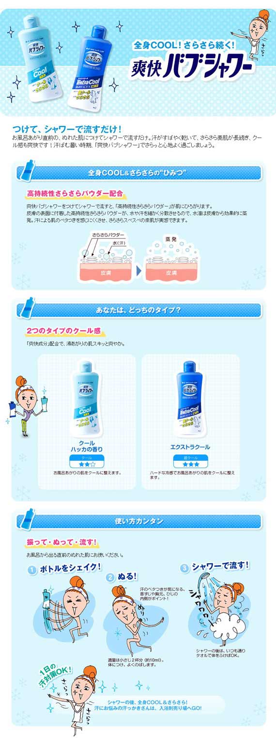 爽快バブシャワー エクストラクール/250mlこういうレビューって初めて書くんですけど、 私みたいに悩んでる人がいるならお勧めします(`・ω・´) 友達とか先輩にも勧められてて、買おうとは思ってたんですけど、 結果アマゾンで買って正解でした(´・ω・`) 製品特徴 ●お風呂をあがる直前のぬれた体につけて流せば、肌クール&さらさらになるシャワー剤で商品の詳細はコチラ! こちらもクリック