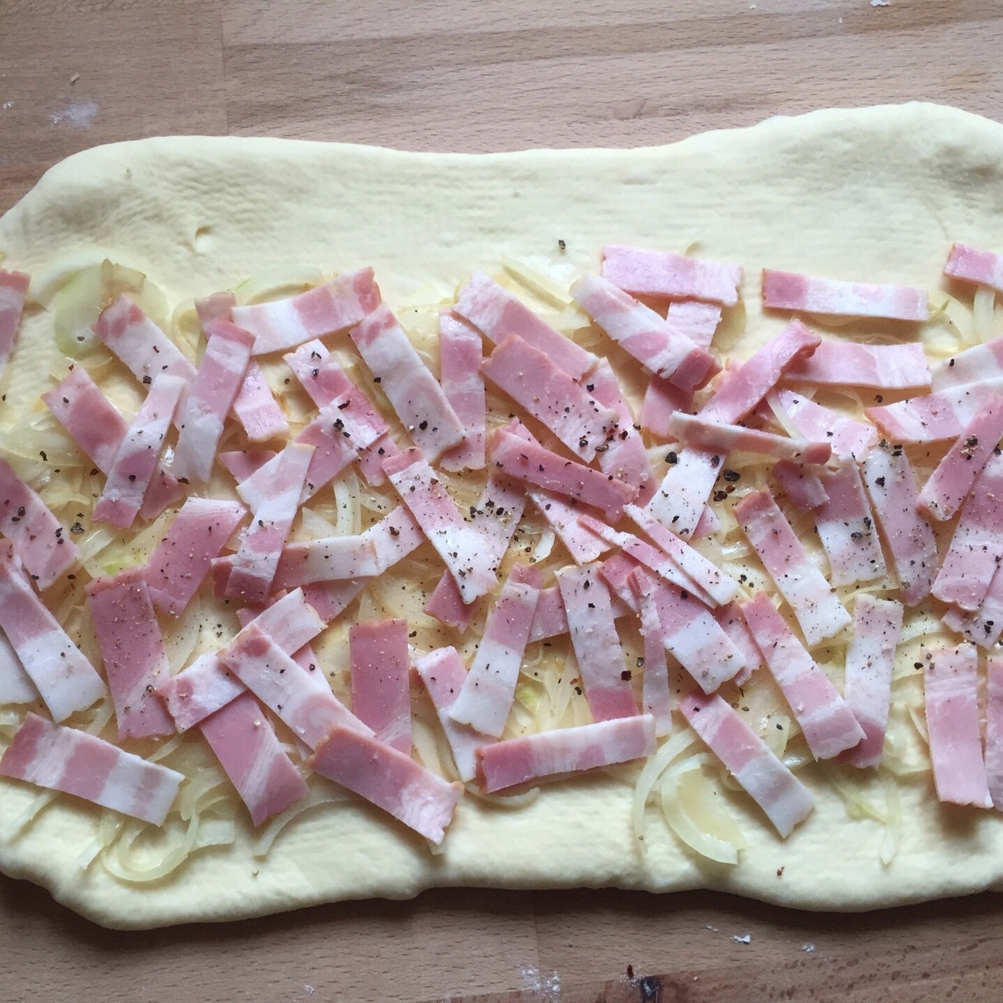 玉ねぎとベーコンを全体に散らし、