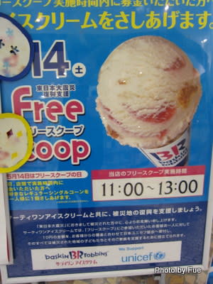 東日本大震災の募金を、店頭の決められ実施時間内にするとシングルコーンをプレゼントしていただけるそうです。