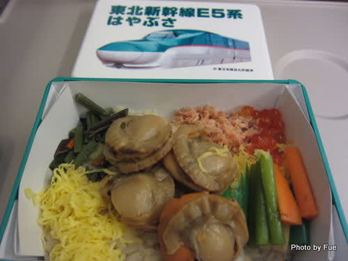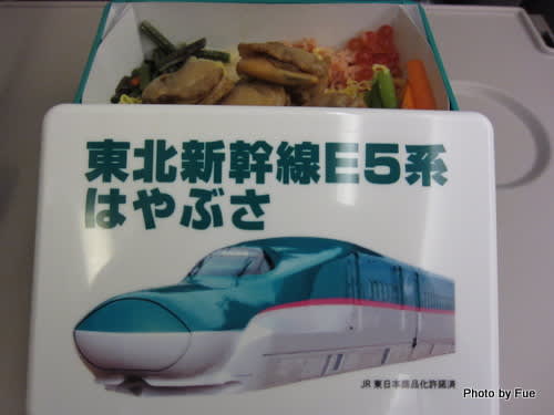 東北新幹線E5系はやぶさ弁当 本来であれば、日本最速のスピードで走る東北新幹線はやぶさ。 実物は本当の鼻が長くてロングロングノーズでした。乗り心地も最高です。そして、はやぶさ内で食べたはやぶさ弁当。鉄子な私ははやぶさk乗車の念願かなって嬉しいのでした。