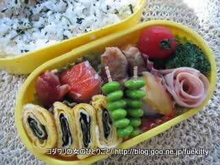 自分用のお弁当です。冷蔵庫のありもので作ったので彩が。。。そんなときは枝豆ピックが彩りのお助け!