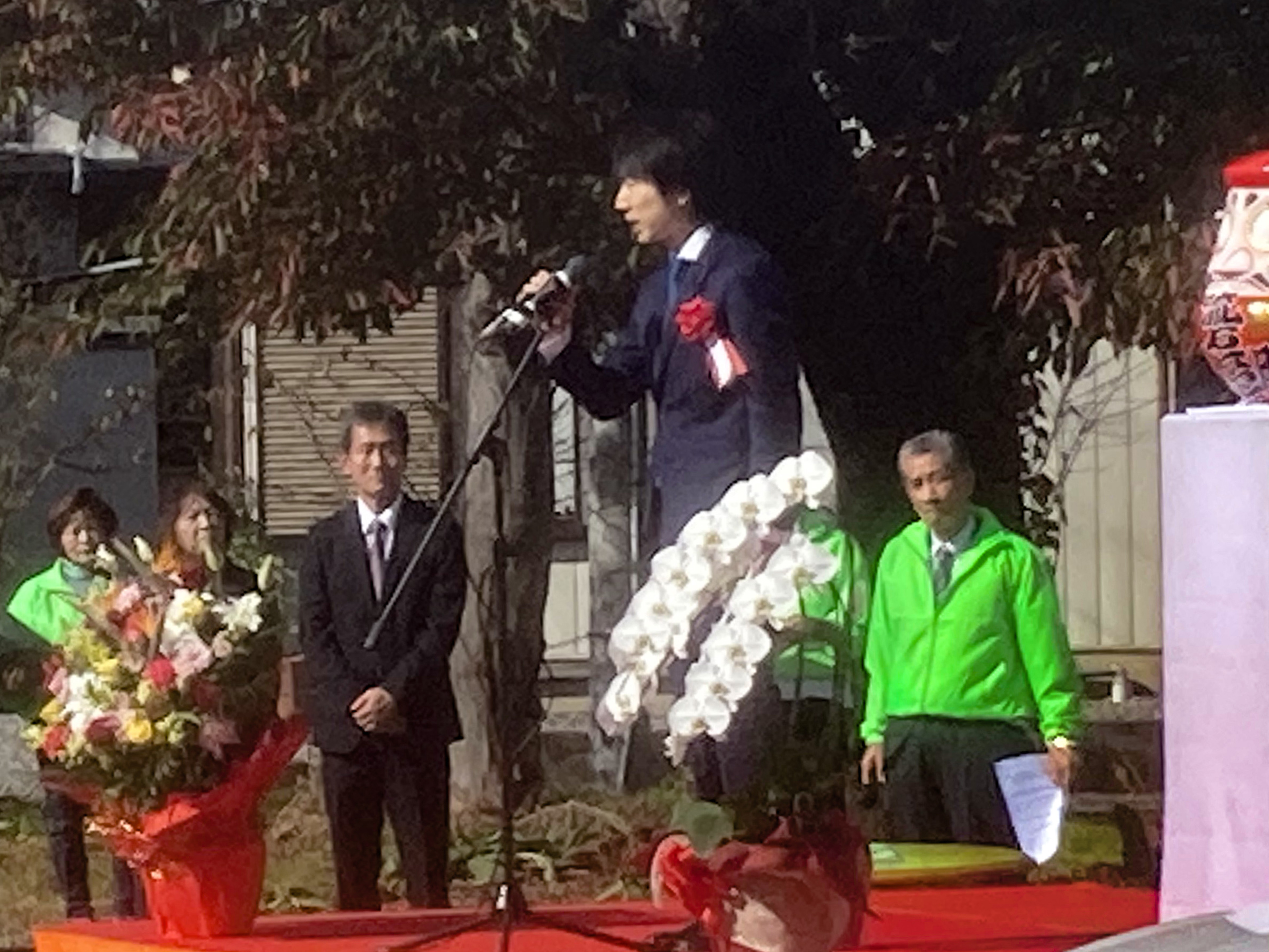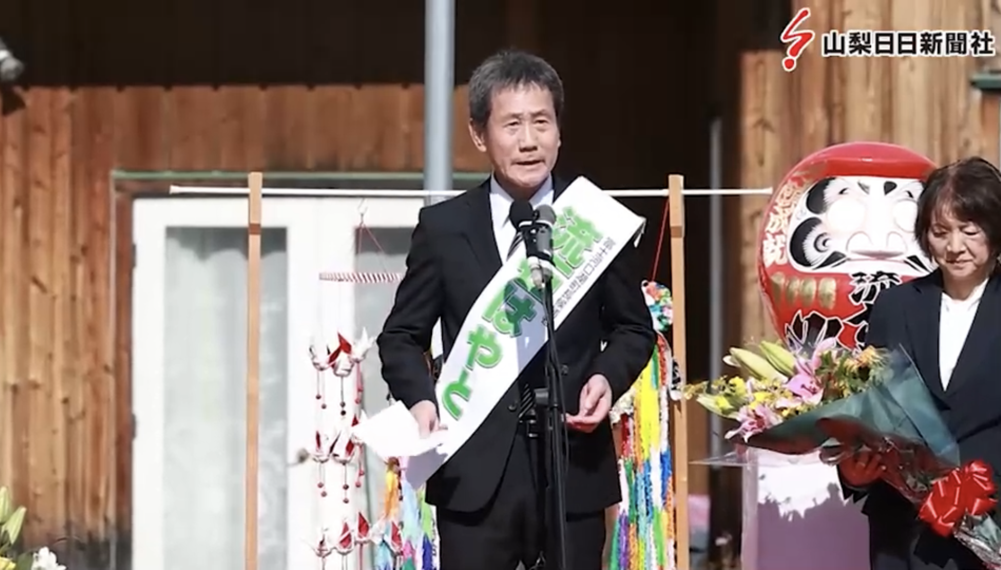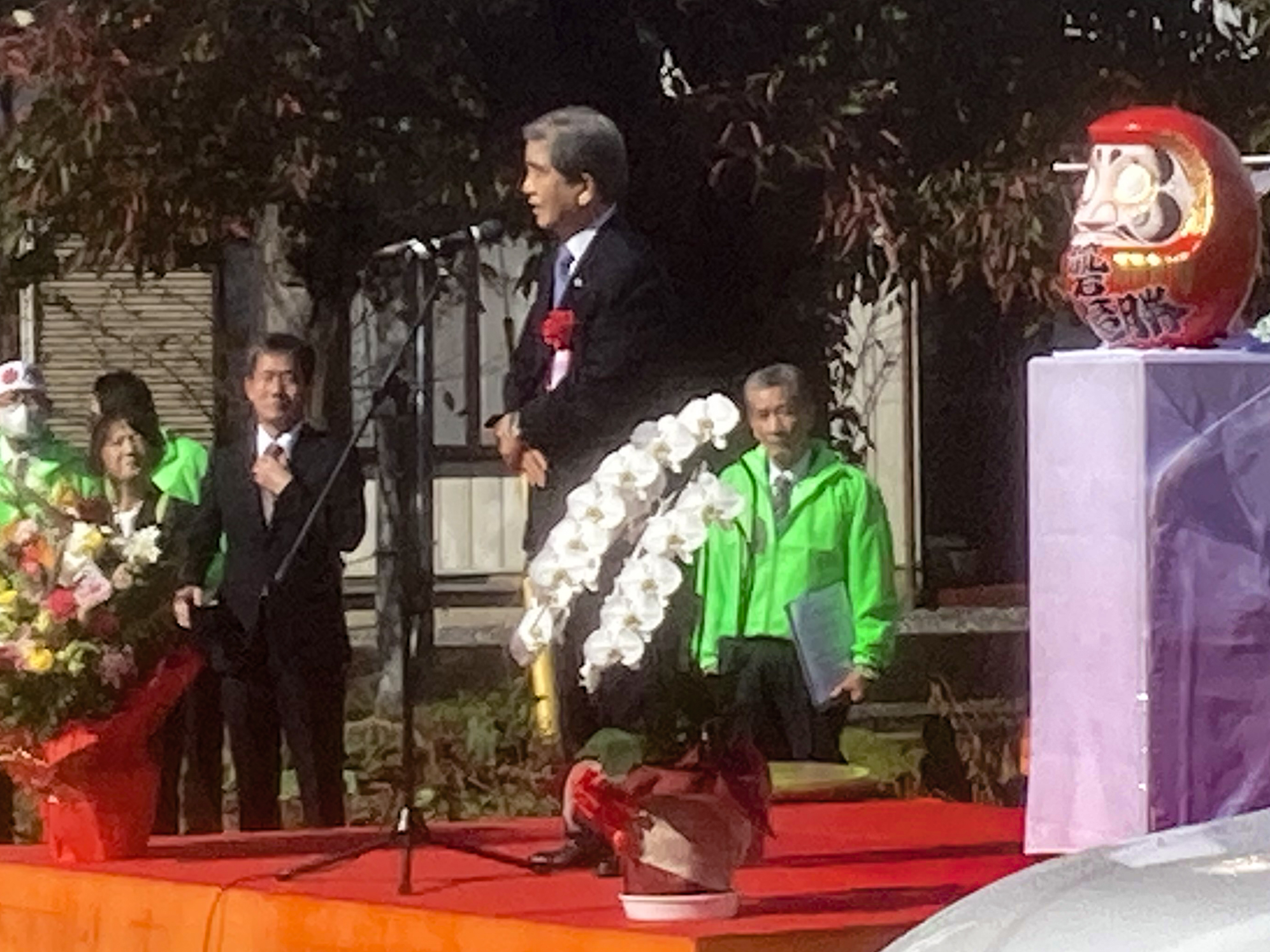 お忙しい中駆けつけてくださいました、自由民主党特別参与 党山梨県連常任顧問 臼井成夫 様、自由民主党新緑の会 渡辺大喜 様からの激励の言葉と、山梨県知事 長崎幸太郎様をはじめとする大勢の皆様からの温かいメッセージ、そして集まってくださった大勢の町民のみなさまの大きなご声援を頂き、すっかり晴れ渡った空の下、無事に出発することができました。