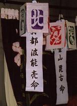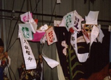 天井から吊された天蓋枠には中央、東、南、西、北や春、夏、秋、冬の文字、また舞殿の周囲には春、夏、秋、冬や松、竹、梅などの慶事物を切り抜いた「切り飾り」が貼られる。