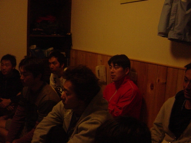 中国合宿1日目ゴホゴホ咳が・・・。それはともかく、今日 合宿 1日目を無事終了しました。いや~ 今シーズン初めての雪上トレーニングと言うこともあり、結構 足元がフラフラで・・・滑走感覚的には、カービングローラーのお蔭で問題は無かったのですがあまりにも、操作方法に間違いがあり 今日の合宿中に一樹さんより指摘のオンパレードでした。(いや~困った。)ミーティング風景です。明日は頑張るしかない。