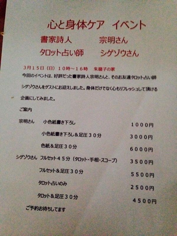朱磨子の家チベット式マッサージ&書家詩人宗明書き下ろし&占い師シゲゾウ