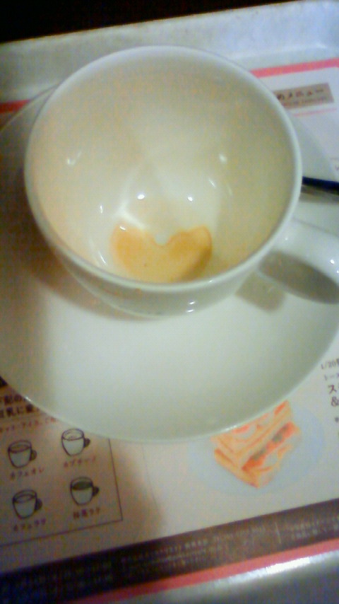 ハートの忘れ物♪移動時間に、 コーヒーをいただいて、 片付けようと思ったら。♪ コーヒーカップの底に、ハート模様が~。 ヽ(´▽`)/ 確かトルコ?では、カップの底に残った飲み物で出来た模様で占いをする~ってのがあった気が。。。 なんだかHappyな偶然で、お片付けカウンターで、思わずぱしゃり。☆