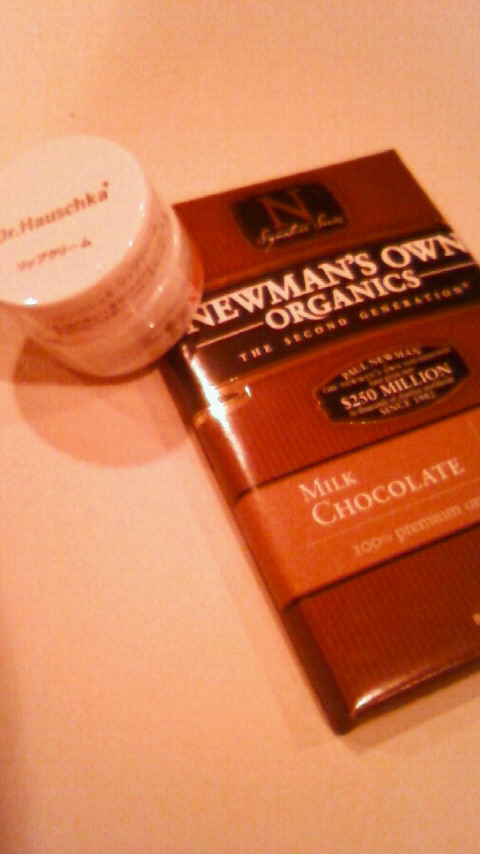 (アメリカ土産のオーガニックチョコレートと、わたしの愛用リップバゥム。)