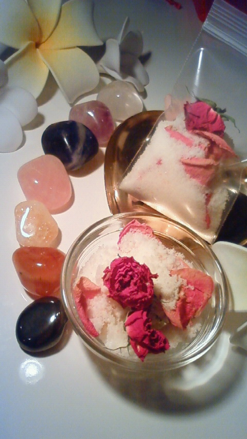 お塩は、おなじみ金粉入りのとっても丁寧に作られたお塩の「極楽塩」・太古の純白・美華塩(高橋ミカさんのデトックスソルト)・ヒマラヤピンクソルト・カリブの塩など、わたしの持ってるお塩ちゃんたちを、ブレンドしました。