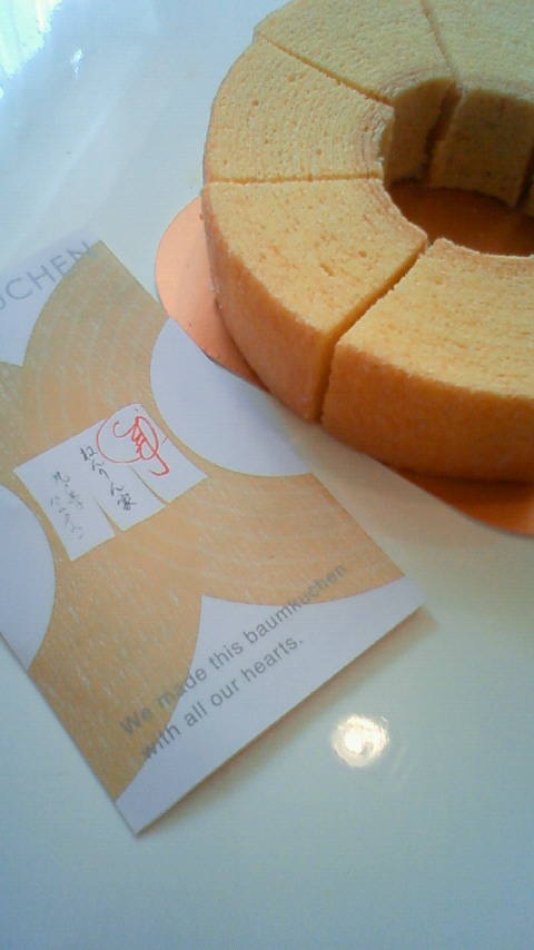 行列の品本人すっかり忘れた頃に、遅れてごめんねと、バースデーのプレゼントをいただきました。ねんりん堂のバゥムクーヘン。バゥムクーヘン大好き~!♪ あ、これ年末に東京駅で行列してたヤツだ~。 (o^o^o)美味でした。ありがとうございました~。☆