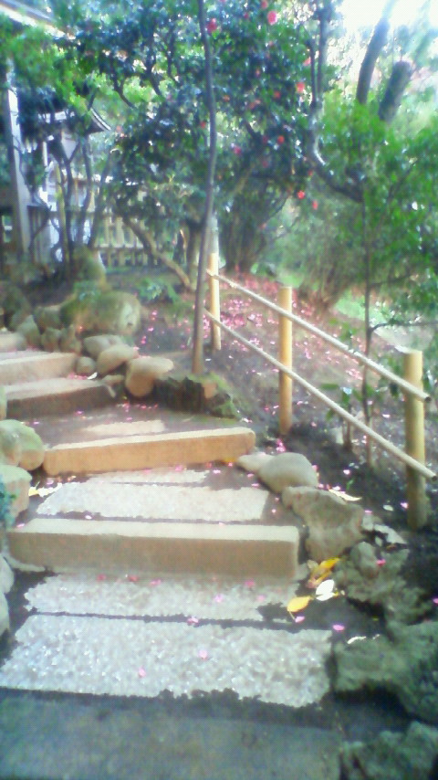 初冬の色神社の裏の祠に上がる階段に、つばきの花びらのデコレーション。つばきのフューシャピンクは大好きな色です。冬の花なのに、南国を思わせてくれますね。黄色と赤に鮮やかに色づいた垣根木の葉の美しさにもうっとり。空も高く蒼く、ついいつもより長居してしまいました。^^色気も食い気も大事、ってことで、帰りに焼き芋を買って帰りました(笑)四の橋商店街の奥の八百屋さんで、冬場は店先で焼き芋を焼いて売ってるんです。♪ 熱々をかじる幸せ~。☆ ヽ(´▽`)/