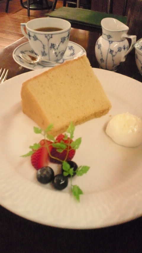 サイフォンで淹れた珈琲と、和三盆のシフォンケーキ・フルーツとクリーム添え。