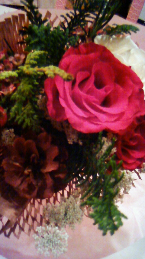 赤白のバラに、まつぼっくりの、クリスマスカラーのブーケをいただきました。