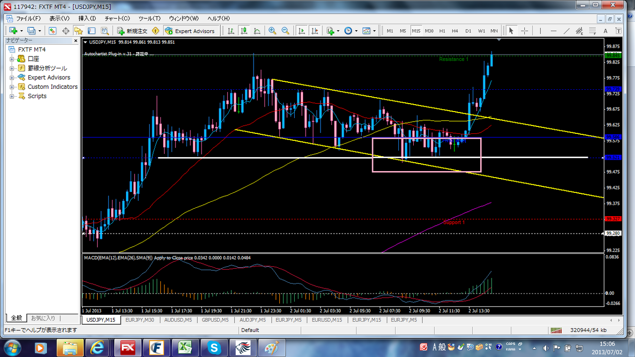 白ラインがレジと見て、ここを抜けて押し目待ち。