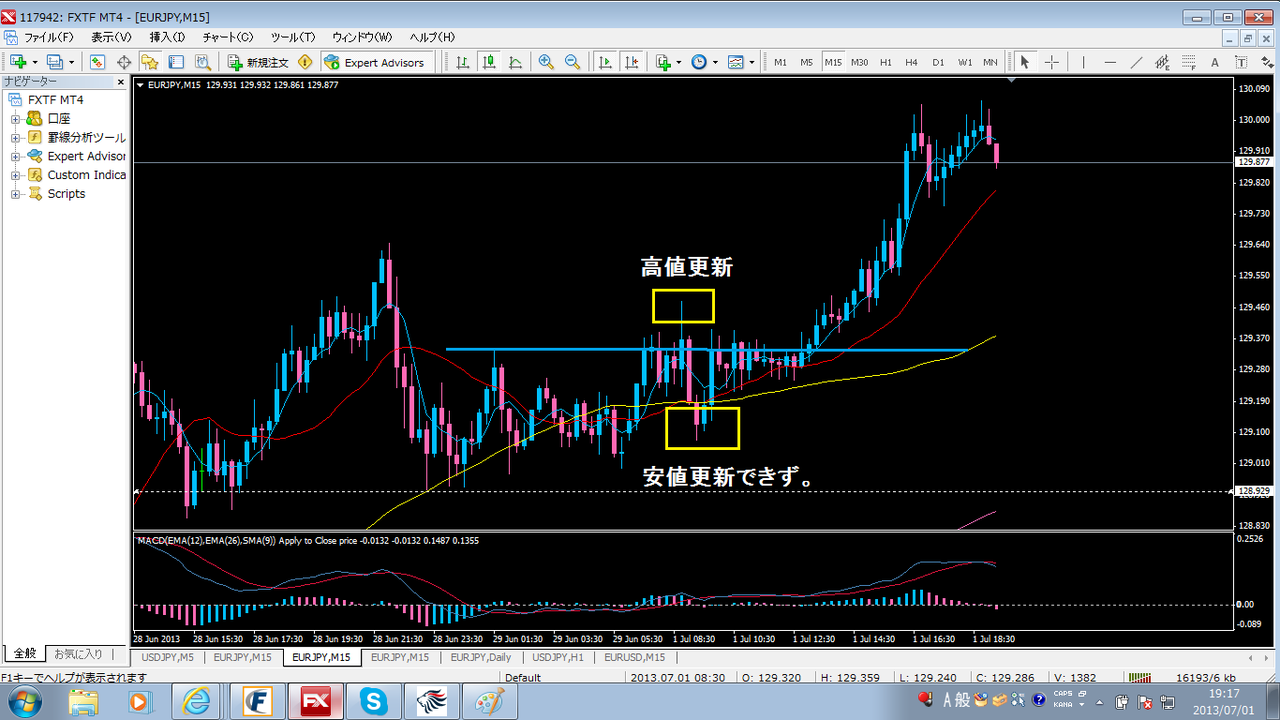 高値更新しつつ、下落するも安値更新しなかった場合は上昇力が強いとみる。