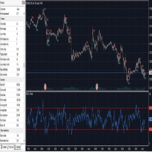 流動性が高いEUR・USDペア、5分単位の時間枠、マーケットオーダーのみを使用して簡単にまとめます。2023年4月を開始点として選択し、30件のトレーディングのサンプルを得るまでRSIに基づく戦略を継続します。大した数字ではありませんが、開始するには十分です。統計的に有効なトレーディングサンプルを判断することは非常に難しい作業です。この詳細については探りませんが、最低でも30件のトレーディングを使用することをお勧めします。
