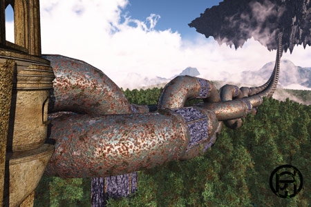 いつ落ちてくるのか、飛んでいくのかわからない巨大なつながれた浮いてる島。