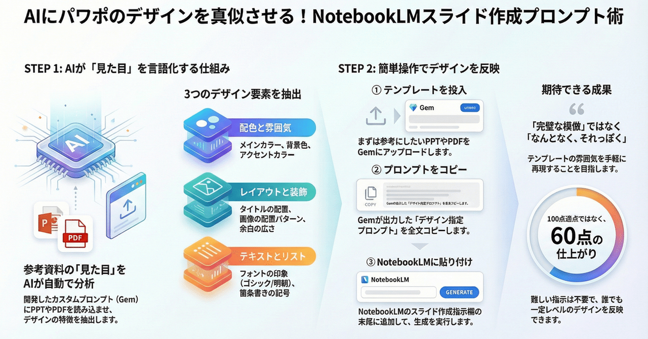 最終的な出力は、Persona Pattern(役割の定義)やChain of Thought(思考過程の記述)、Few-Shot Prompting(例示)といった高度なプロンプトエンジニアリング技術が組み込まれており、そのままコピー&ペーストしてすぐに使えるマークダウン形式のテンプレートで提供されます 。
