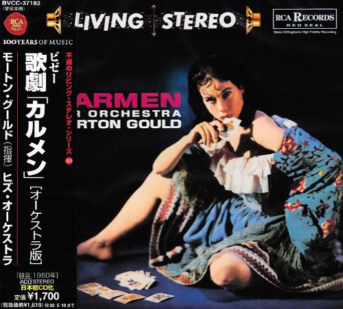 そんなことで通常の組曲とは一味違う、モートン・グールド自らがアレンジした、オーケストラ版によるオペラ「カルメン」のエッセンスを味わうことができます。つまり、1960年に録音された当アルバムは、グールド自らがビゼーのオペラ「カルメン」の有名曲を取り出し、オーケストラ演奏用に全20曲にアレンジしたいわば「オーケストラ版のいいとこどり」で、ビゼーのオリジナルのオーケストレーションを基本に、M.グールドらしいアレンジを施しており、45分間でこのオペラのエッセンスを味わうことができるようになっています。ただ、この日本盤ジャケットデザインで損をしています。全くカルメンをイメージすることができませんからねぇ。オリジナルは下記でカルメンの狡賢さをうまく表出しています。