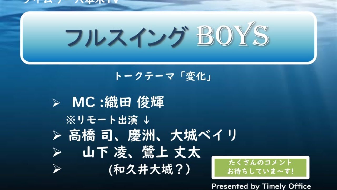 タイムリー六本木TV「フルスイングBOYS」タイムリー六本木TV毎月第1火曜日は「フルスイングBOYS」MC; 織田俊輝リモート出演 ;高橋司、慶洲、大城ベイリ、山下凌、鶯上丈太 (和久井大城?)※トークテーマ「変化」とにかくみんなで、フルスイング・トーク!!どうぞ、楽しみに~。D,酒田youtu.be