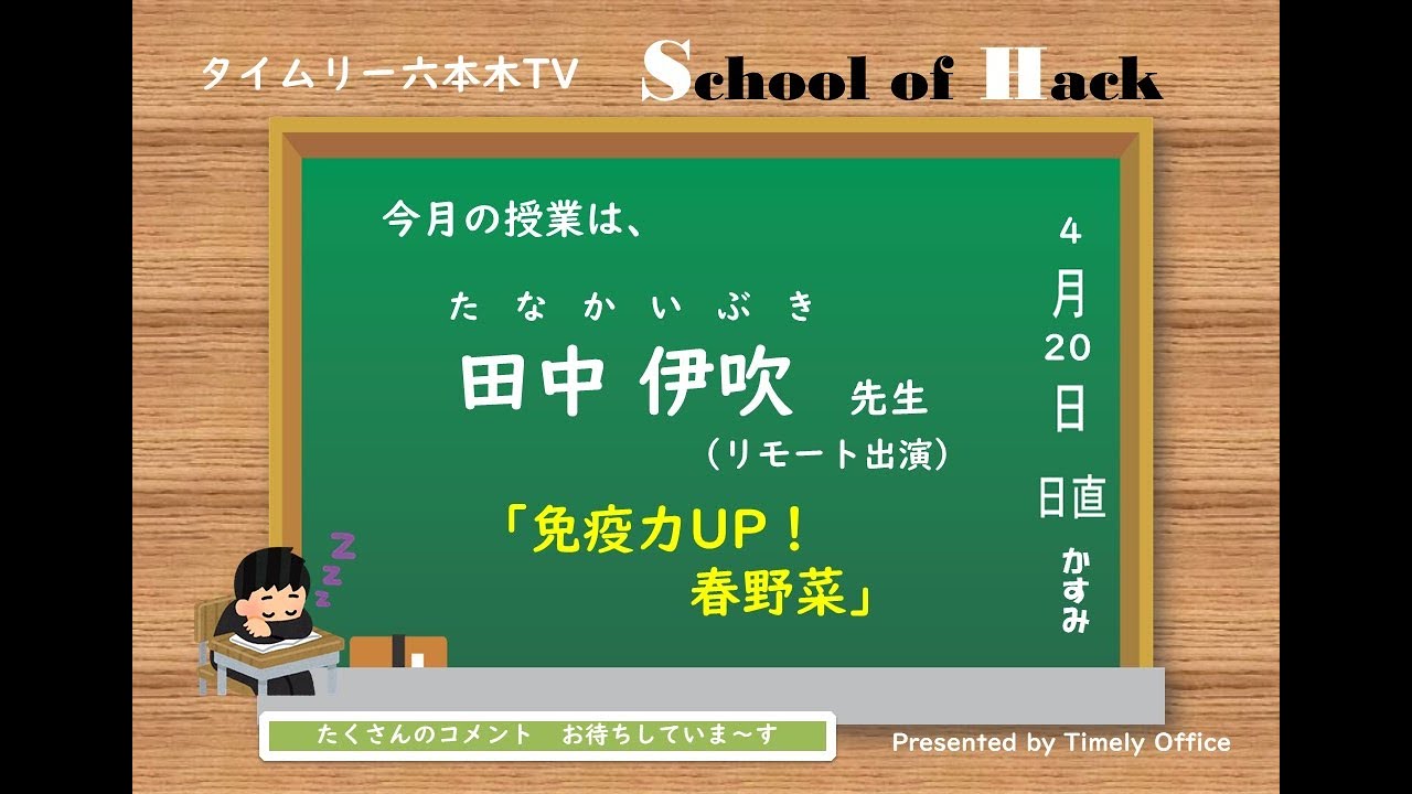 タイムリー六本木TV「スクールオブハック」タイムリー六本木TV「スクールオブハック」★4/20(火) 20時〜、YouTubeLiveにて生配信!出演:田中伊吹(リモート出演) ※生徒代表:栗林かすみ 『免疫力UP!春野菜』について https://youtu.be/1WH8aQThSy4タイムリー六本木TV「スクールオブハック」タイムリー六本木TV毎月第3火曜日は「スクールオブハック」タイムリーオフィスのタレントの中から専門分野など知識を持ったメンバーを講師として招き、きっと役立つ?情報をお届けする番組です!今回の講師は、田中伊吹 先生(リモート出演) 「免疫力UP!春野菜」についてレクチャーしてくれます。 ※生徒代表;栗林かすみど...youtu.beたくさんのコメントお待ちしてます!