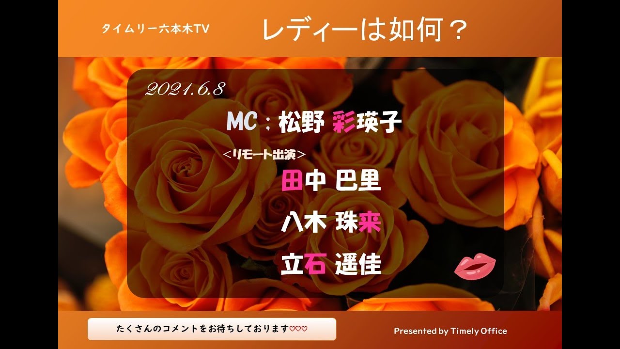 タイムリー六本木TV「レディーは如何?」#16タイムリー六本木TV毎月第2火曜日の「レディーは如何?」女性タレントのメンバーが毎月入れ替わり、素敵なレディーを目指す番組です!メンバー、MC;松野彩瑛子 リモート出演;田中巴里、八木珠来、立石遥佳どうぞ、お楽しみに~!!D,酒田youtu.be