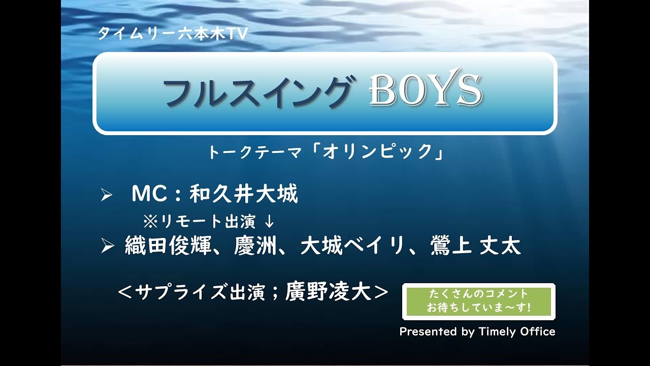 タイムリー六本木TV「フルスイングBOYS」タイムリー六本木TV毎月第1火曜日は「フルスイングBOYS」MC; 和久井大城リモート出演 ;慶洲、大城ベイリ、鶯上丈太、(織田俊輝?) ※トークテーマ「オリンピック」とにかくみんなで、フルスイング・トーク!!どうぞ、楽しみに~。D,酒田youtu.be