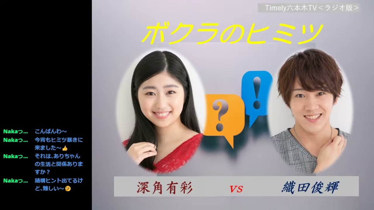 タイムリー六本木TV(ラジオ版) 「ボクラのヒミツ」タイムリー六本木TV(ラジオ版)「ボクラのヒミツ」★4/28 (木) 20時~、YouTubeLiveにて生配信! 出演:織田俊輝 、深角有彩※コーナー担当:田中くるみhttps://youtu.be/09mIemk6Wz8<ラジオ版>『ボクラのヒミツ』#13タイムリー六本木TV<ラジオ版>毎週木曜日の20時~生配信あくまで<ラジオ版>として音声にてお楽しみ下さい!第4木曜日は、「ボクラのヒミツ」今回の出演メンバーは、織田俊輝、深角有彩 ※コーナー担当;田中くるみそれぞれが抱えた「秘密」を当て合うゲーム形式のトーク・バラエティー番組です!アナタは、ヒミツを暴けますか?...youtu.be秘密を当て合うトークゲーム・バラエティー番組アナタはヒミツを暴けるかな⁈コメントでのサポートお願いします!