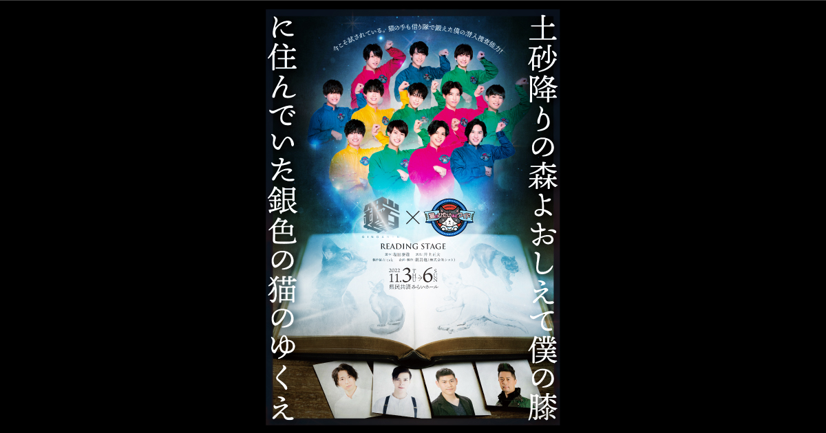 銀岩塩×猫のひたいほどワイド READING STAGE『土砂降りの森よおしえて僕の膝に住んでいた銀色の猫のゆくえ』 | デジタル3ch テレビ神奈川芝居・アクション・音楽・映像が融合した次世代ライブエンターテイメント集団「銀岩塩」と「猫ひた」がコラボレーション!番組初のREADING STAGE(朗読劇公演)の開催決定!www.tvk-yokohama.com