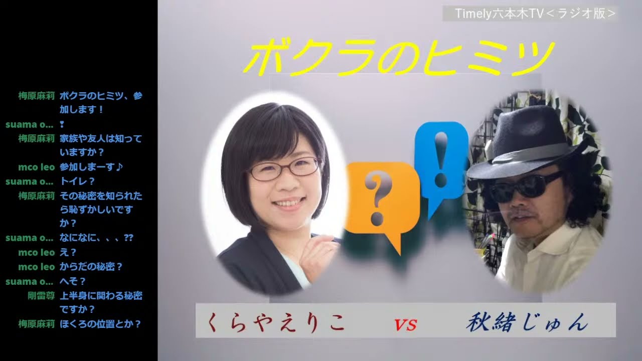 タイムリー六本木TV(ラジオ版) 「ボクラのヒミツ」タイムリー六本木TV(ラジオ版)「ボクラのヒミツ」★11/24(木)20時~、YouTubeLiveにて生配信!出演:くらやえりこ、秋緒じゅん※コーナー担当;金子晄士https://youtu.be/XCDPJ421QWs<ラジオ版>『ボクラのヒミツ』#20タイムリー六本木TV<ラジオ版>毎週木曜日の20時~生配信あくまで<ラジオ版>として音声にてお楽しみ下さい!第4木曜日は、「ボクラのヒミツ」今回の出演メンバーは、秋緒じゅん、くらやえりこ ※コーナー担当;金子晄士それぞれが抱えた「秘密」を当て合うゲーム形式のトーク・バラエティー番組です!アナタは、ヒミツを暴けます...youtu.be秘密を当て合うトークゲーム・バラエティー番組アナタはヒミツを暴けるかな?!是非コメントでのサポートお願いします!