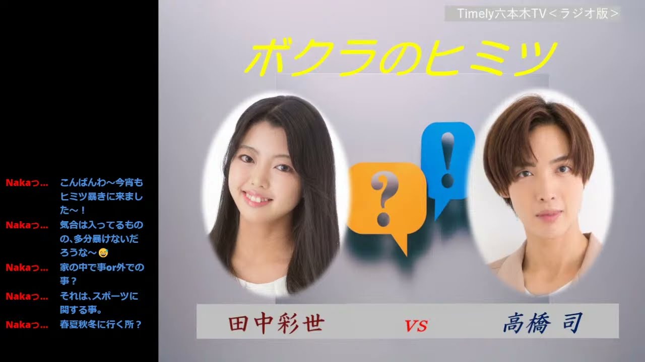 タイムリー六本木TV(ラジオ版) 「ボクラのヒミツ」タイムリー六本木TV(ラジオ版)「ボクラのヒミツ」★12/22(木)20時~YouTubeLiveにて生配信!出演:高橋司、田中彩世※コーナー担当:西尾咲良https://youtu.be/HBZ2amzEzEw<ラジオ版>『ボクラのヒミツ』#21タイムリー六本木TV<ラジオ版>毎週木曜日の20時~生配信あくまで<ラジオ版>として音声にてお楽しみ下さい!第4木曜日は、「ボクラのヒミツ」今回の出演メンバーは、田中彩世、ほか ※コーナー担当;西尾咲良それぞれが抱えた「秘密」を当て合うゲーム形式のトーク・バラエティー番組です!アナタは、ヒミツを暴けますか?!是非...youtu.be秘密を当て合うトークゲーム・バラエティー番組アナタはヒミツを暴けるかな?!是非コメントでのサポートお願いします!