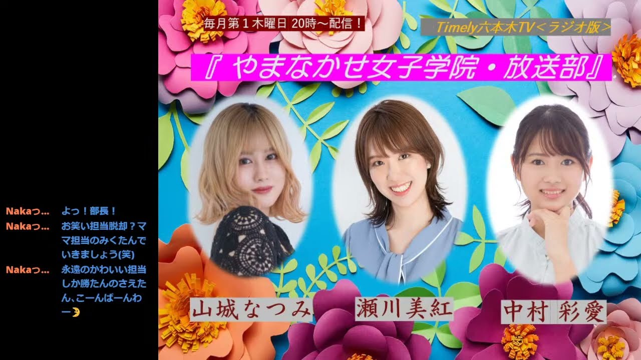 タイムリー 六本木TV <ラジオ版> 「やまなかせ女子学院・放送部」タイムリー 六本木TV <ラジオ版>「やまなかせ女子学院・放送部」★4/6(木)20時〜、YouTubeLiveにて生配信!出演:瀬川美紅、山城なつみ、中村彩愛https://youtube.com/live/C2kM_qQfTcI<ラジオ版>「やまなかせ女子学院・放送部」#13タイムリー六本木TV<ラジオ版>毎週木曜日の20時~生配信あくまで<ラジオ版>として音声にてお楽しみ下さい!第1木曜日は「やまなかせ女子学院・放送部」 出演;瀬川美紅、山城なつみ、中村彩愛たくさんのコメントお待ちしております。D.(顧問?)酒田youtube.comたくさんのコメントお待ちしています!